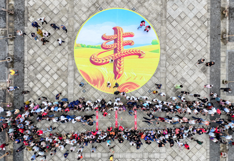 9月25日,四川省华蓥市阳和镇祝家坝村,群众在“庆丰收·迎国庆·话中秋”活动中参加拔河比赛(无人机照片)。 新华社 邱海鹰 摄
