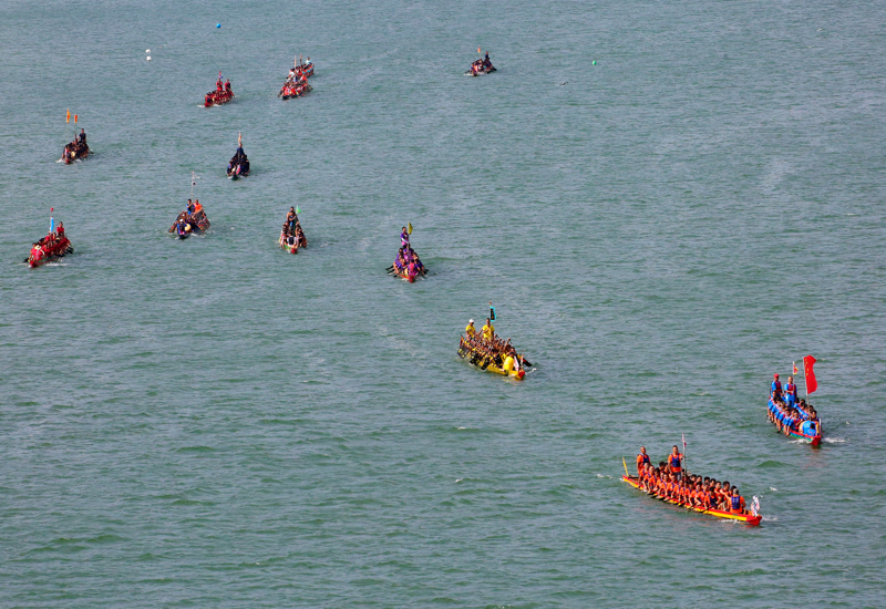 9月24日,广西融水苗族自治县的融江河面上,龙舟队伍在角逐,喜迎国庆中秋佳节。\n 新华社 龙林智 摄