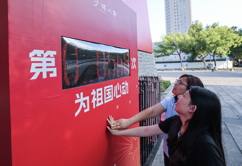 9月25日,浙江省嘉兴市南湖区建设街道的子城城墙边,市民参加我为祖国心动打卡活动。\n 新华社 徐昱 摄