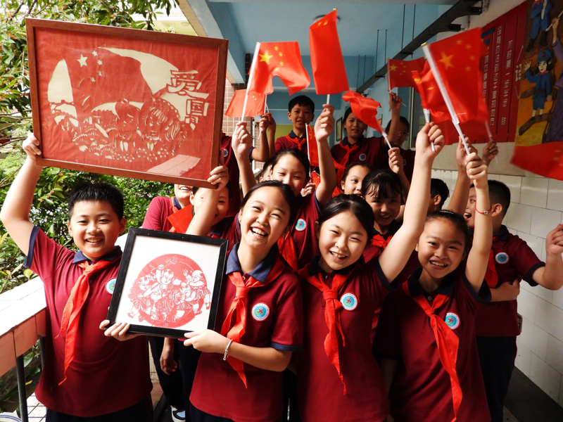 9月26日,四川省达州市开江县西城小学,小学生展示制作的“祝福祖国”创意剪纸作品。\n 新华社 邓良奎 摄