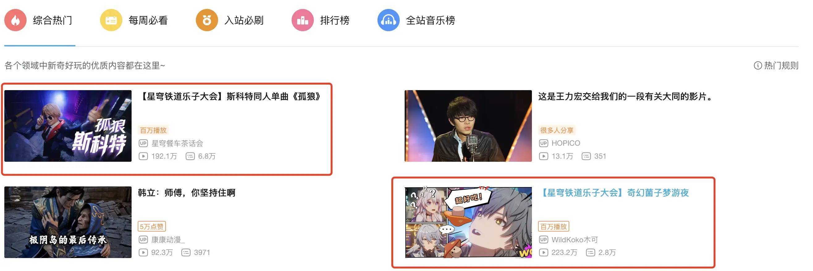 整个乐子大会的节目制作都很精良,而且趣味拉满,因此视频播放量短短两天就突破了千万大关,多个视频都登上了小破站的热门榜单,崩铁的二创可以说再一次达到了破圈的效果。
