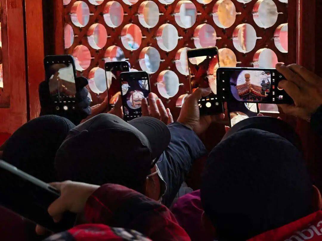 再向前走,依次经过仪门、正殿,不少人举着手机围在正殿窗户前,透过镂空的缝隙拍前面的御碑亭,解锁打卡新方式。“不知道从哪来的构图方式,看到大家都这么拍,我也这样拍了!”一位游客说道。